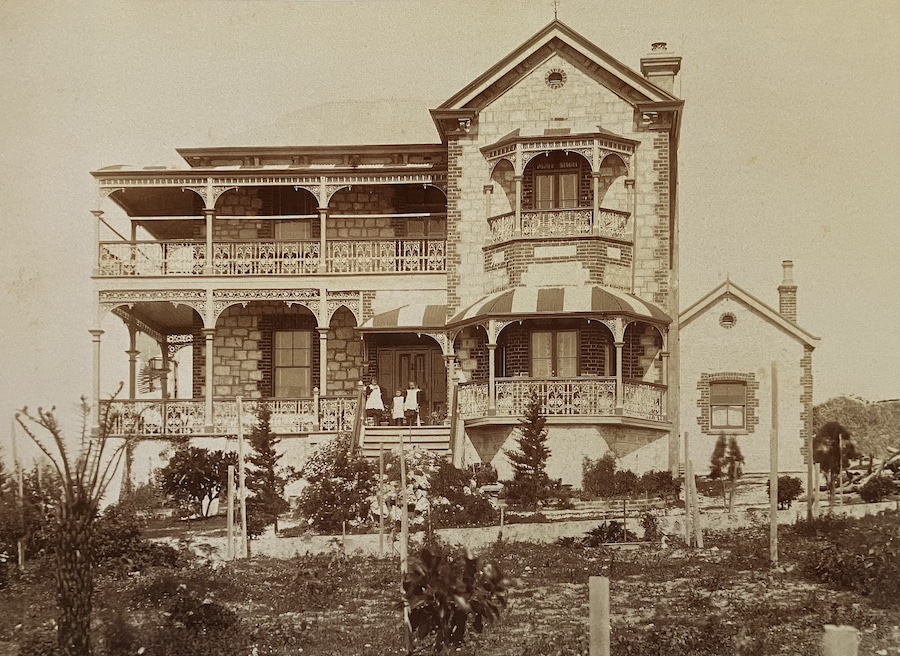 Above: "Riverview," the residence built in 1889 at 75 Tuckfield Street for Edward Mayhew. He had purchased the land from William Sandover, a friend and business neighbour in Newman Street. The prominent position of the house is reflected in the Daily News account of an explosion in a powder store connected with the harbour works, about a kilometre away: "Mr E.W. Mayhew's residence at Plympton was shaken to such an extent that the ceiling collapsed, and Mr Mayhew sustained a severe cut on the knee from the falling debris."