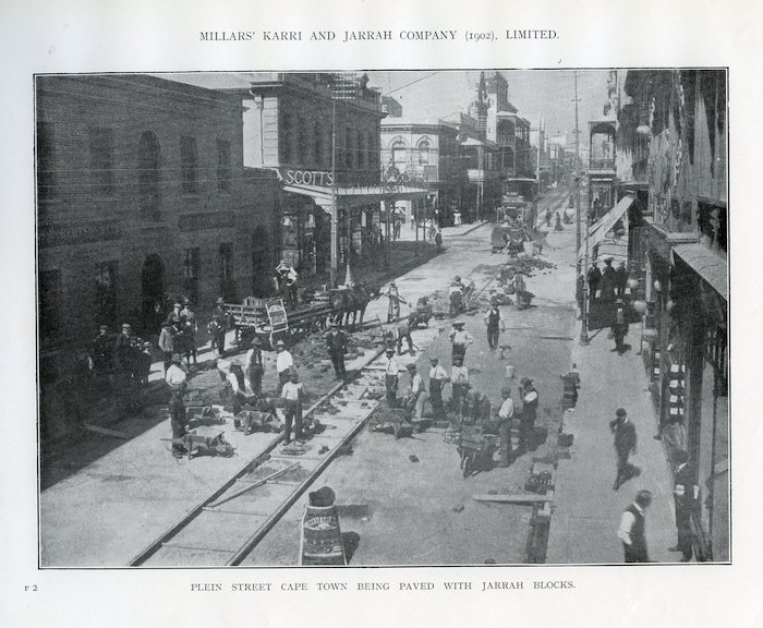Cape Town Street paved with jarrah blocks: “Millars’ Karri & Jarrah Company (1902) Limited” c 1908 (Dowson collection)