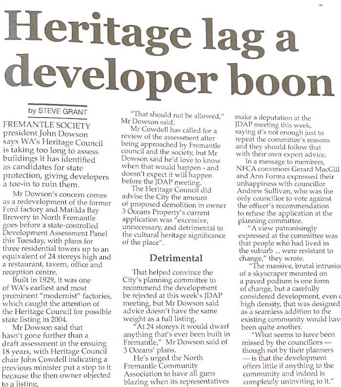 Fremantle has been let down again by Cr Sullivan, who spoke against the officers recommendation for refusal, in what one councillor said was the longest speech in the history of the planning committee. During the marathon, he stated that " all heritage boxes had been ticked", though that is not the view of the heritage experts - The Fremantle Society, the Heritage Council, and the planning staff at Fremantle Council.