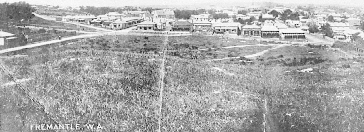 Looking down at Burt Street, which extends across most of the photograph, from the vicinity of Cantonment Hill. Fremantle Library Local History Collection 1903 image #534A. The Library caption has: 'View of Fremantle from vicinity of Cantonment Hill. Note: Lunatic Asylum, Quarry Street, Burt Street and Skinner Street.'