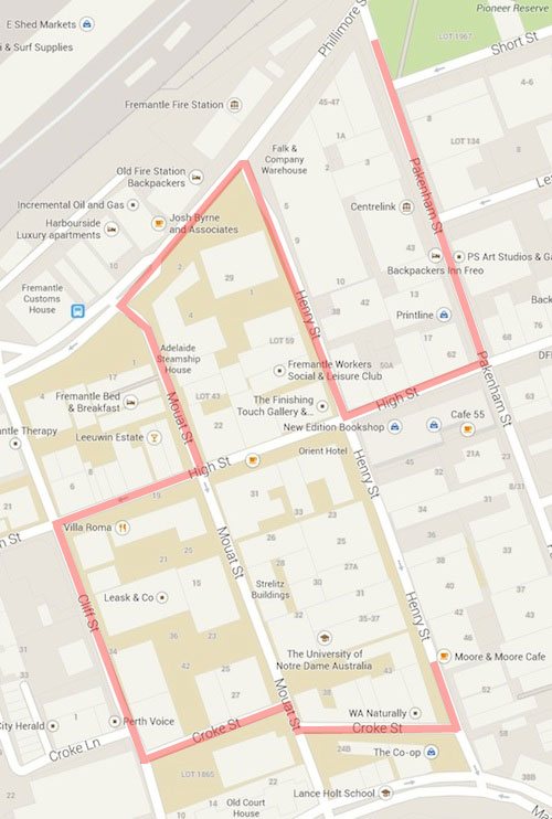West End | High St | Pakenham St | Henry St | Mouat St | Cliff St | Phillimore St