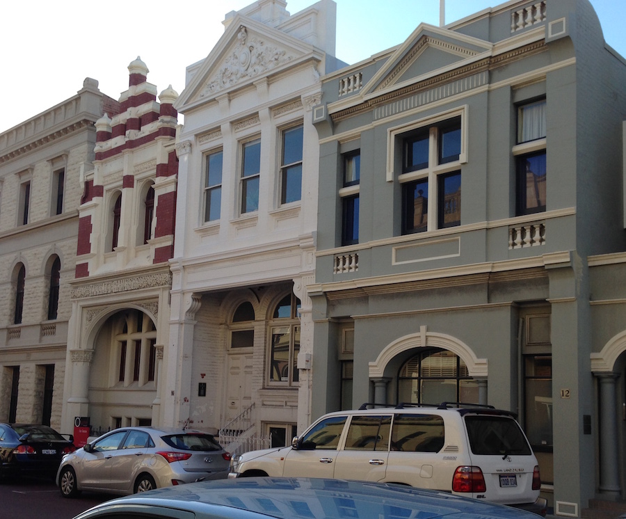 Atlas Chambers, 6-8 Cliff St, has had various owners, including the Helpman family 1855-81. On the right is the 1986 garden courtyard of the Fremantle Hotel, which is on the corner of Cliff and High Sts.