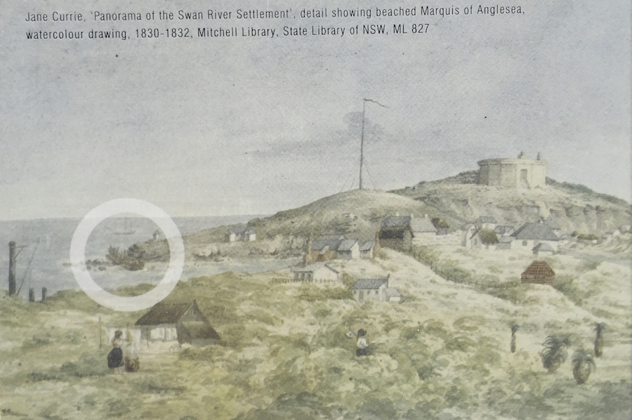 Jane Currie arrived 2 June 1829 on Parmelia, the first ship to bring settlers to the colony, with her husband Mark Currie, the first harbour master. He started work in a tent at Perth, but soon moved to the wreck of Marquis of Anglesea. Jane Currie painted in watercolour a panorama of Fremantle south of Arthur Head which includes the wreck where her husband had his office.