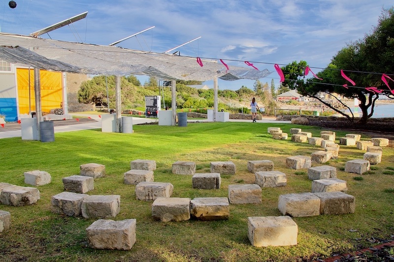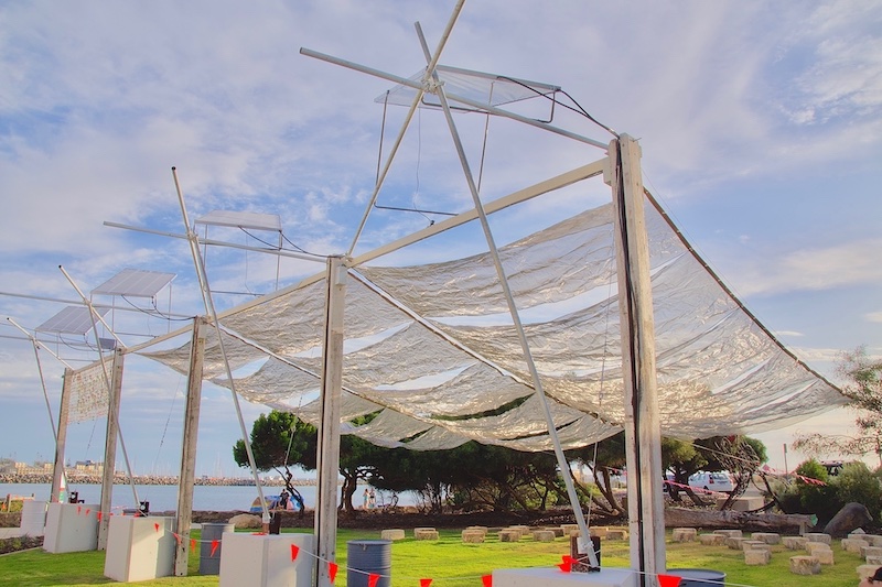 The Er Pavilion forms a new together-space, crafted from remnant timbers salvaged from the Fremantle Ports A Shed, anchored by limestone, and covered by a shimmering and woven ceiling – adorned with thread collected from Bathers Beach.