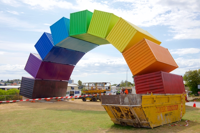 The 'Rainbow' structure by Marcus Canning is 'art', I suppose. Called 'Containbow' by the local paper (because it's made of shipping containers painted in 'rainbow' colours) it is going to have to move from the East Street/Canning Highway site because it's on a Main Roads reserve, and in 2022 they need to use the area for ramps leading to the new traffic bridge that will replace 1939 wooden one that is no longer fit for purpose. Photo credit: Roel Loopers.