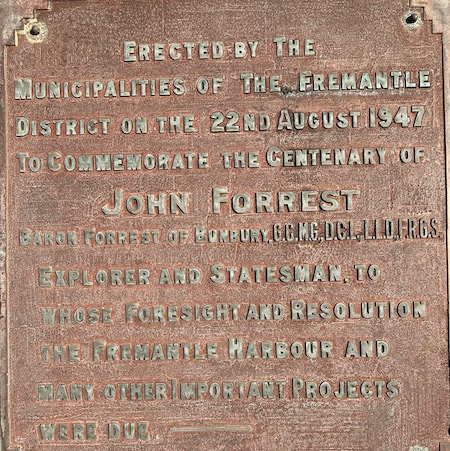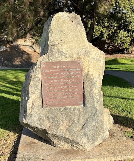 The John Forrest Centenary memorial on Beach Street Reserve, from 22 August 1947, had a spherical beacon on top of a piece of granite. The beacon was stolen in about 2021. The commemoration was that of the centenary of Forrest's birth. It was originally at the southern end of the wooden Traffic Bridge, but moved in 1964 to Beach Street - unfortunately, as it's turned out.