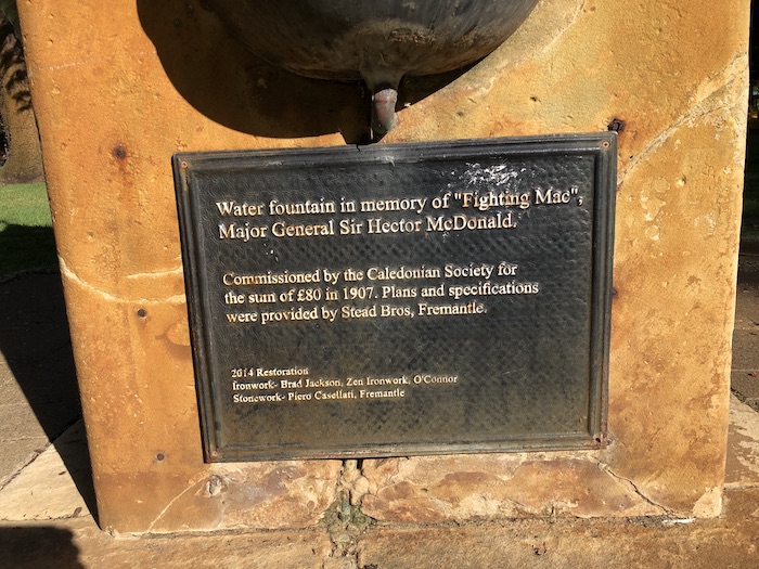 Hector McDonald drinking fountain, erected c. 1907 by public subscription to the memory of "Fighting Mac" who died in 1903 by shooting himself following accusations of paedophilia in Ceylon. He never came to Australia, let alone Fremantle. Why is this thing still here?