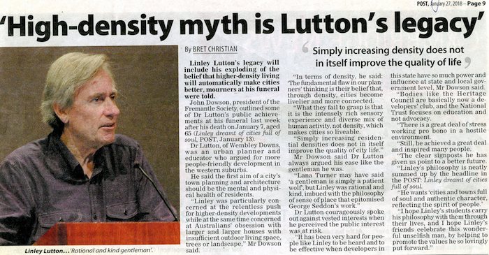 John Dowson, president of the Fremantle Society, outlined some of Dr Lutton’s public achievements at his funeral last week after his death on January 7, aged 65 (Linley dreamt of cities full of soul, POST, January 13).