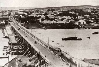 Aerial photo from 1947 showing the first rail bridge on the left, the 1939 traffic bridge in the middle, and the remains of the not-yet-demolished RHLB. The red-ringed building is a PWD depot - on what is now Beach Street Reserve, roughly where The Kiosk now stands.