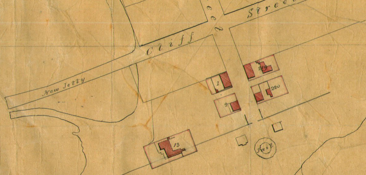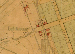 When the railway was laid between Cliff Street and the Arthur Head 'cliff', it may have required building adjustments, as this overlay, kindly provided by Lee-Anne Percival, tends to suggest. (See the map a bit further down this page.) She has overlaid the 1853 map shown at the top of this page with an 1898 map drawn after the railway went through.