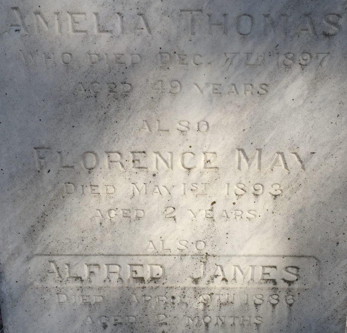 106. Amelia Thomas d. 1897 @ 49 & Florence May d. 1893 @ 2 & Alfred James d. 1886 @ 2 months