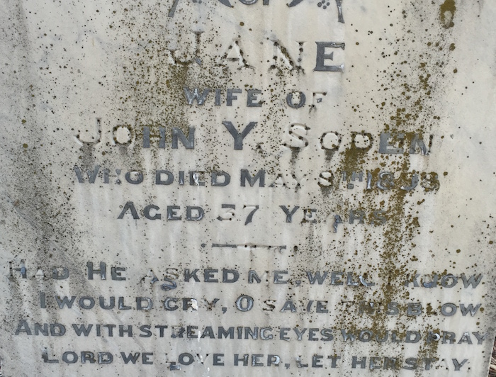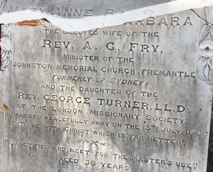 120. Mary Anne Barbara Fry d. 15 July 1887 @ 38 'beloved wife of Rev. A.G. Fry minister of the Johnston Memorial Church Fremantle formerly of Sydney and the daughter of Rev. George Turner LLD of the London Missionary Society' 'to be with Christ which is far better' 'sanctified and meet for the Master's use'