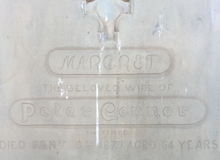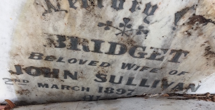 112. Bridget Sullivan d. 1897, wife of John. The stone is broken into four pieces, and the name is not on the top piece as presently stacked. There were also children in the grave, incl. Patrick d. 1888, Mary d. 1891, May d. 1894.