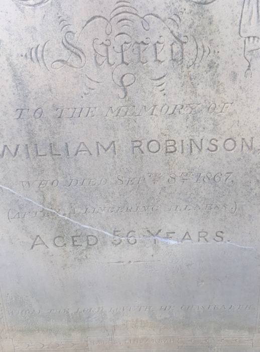 122. William Robinson d. 8 Sept 1867 @ 56 'after a lingering illness' 'whom the Lord loveth he chasteneth' stone by Bates, Pinjarrah [sic]