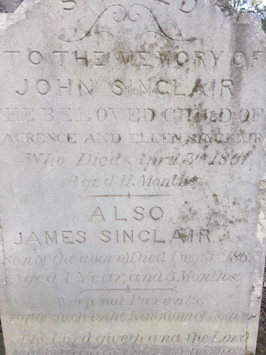 123. John Sinclair d. 3 Apr 1861 @ 1 & James Sinclair d. 3 Dec 1867 @ 1 sons of Laurence & Ellen Sinclair