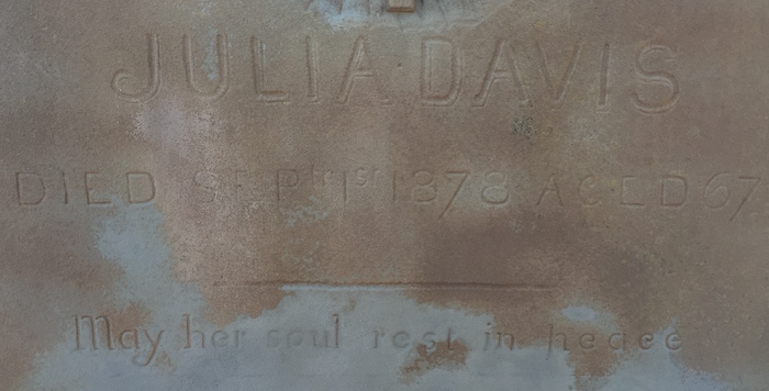 78. Julia Davis d. 1 Sept 1878 @ 67; this stone is now broken in two, with the top half lying on the ground