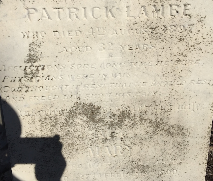 92. Patrick Lambe d. 1897 @ 82 & Mary, his wife d. 1900