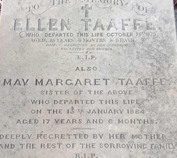 Ellen Taaffe, #121, died 25 Oct 1879 aged 15, and May Margaret Taafe her sister died 15 Jan 1884 aged 17. When Ellen (aka Helen) was 11, she was a witness in a case which was heard by magistrates Slade and (Charles) Finnerty (after whom the street is named). They both accused a priest of tampering with the witness (tutoring her in what evidence to give), which caused a furore in the Catholic church. Diane Oldman tells Finnerty's story here. He was Commandant of the Enrolled Pensioner Force; my page is here.