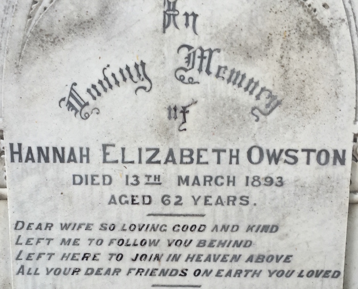 Hannah Elizabeth Owston, #73, who died 1893 aged 62, may possibly (though this is yet to be confirmed) have been the second wife of William Owston (1824-1903). His first was Sarah Eustace Caporn (b. 1820), who died 1880 in Cambs. Owston had an adventurous, seafaring early life, and was a successful businessman whose name is still on a large building in the first block of High St. See the page about him here.