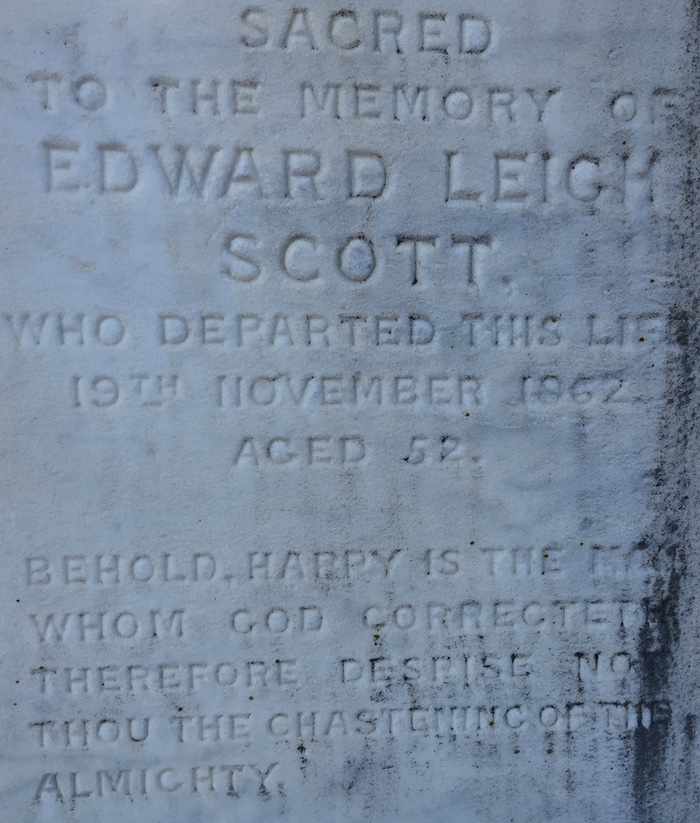 Edward Leigh Scott, #85, died 1862 aged 52. What did he do wrong? His epitaph suggests something bad: 'Behold, happy is the man whom God corrected. Therefore despise not thou the chastening of the almighty.'