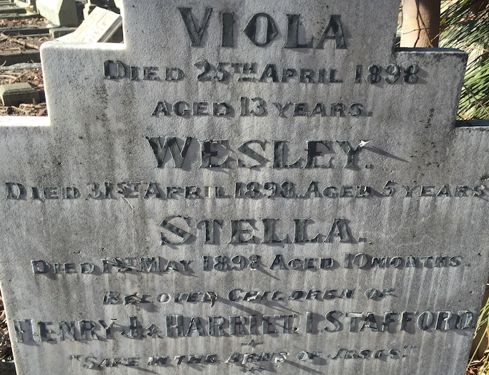 The Stafford children, #88, all died in two months, April-May 1898. They were children of the unfortunate Henry and Harriet Stafford: Viola, 13, died 25 April, Wesley, 5, died 31 April, and Stella, 10 months, died 1 May. What killed them?