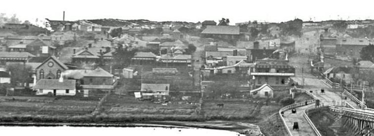 Swan Street Fremantle. It's possible that the church building on the left of this clip from a 1905 photograph is the former Congregational church. That's the Swan Hotel on the right next to the main road, and Swan Street used to run parallel to the river, so that building would be on Swan Street. The position of the church in the street is not yet known to me.
