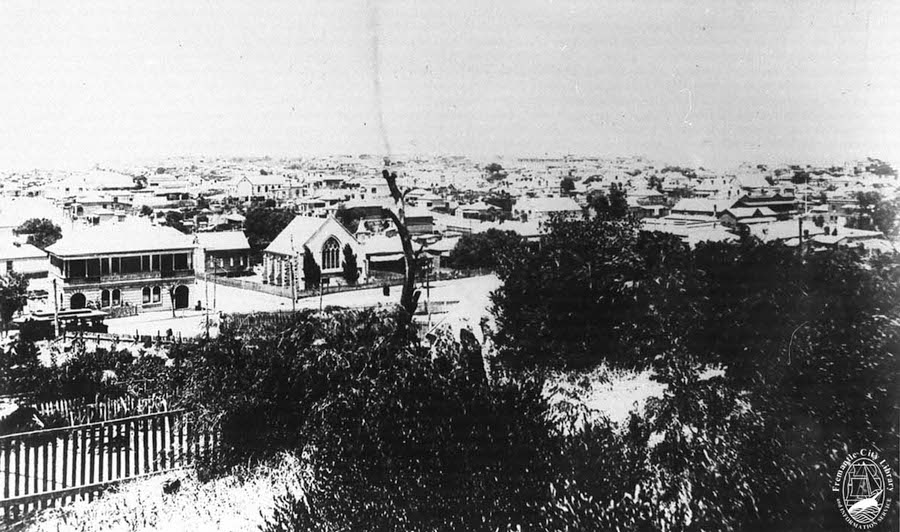 Photograph 881 from the Fremantle City Library Local History Photographic Collection. Date 1905-1920. Text from the Library entry. Where the church was is now the middle of Stirling Highway. The post office still stands, right at the corner of that and Canning Highway.