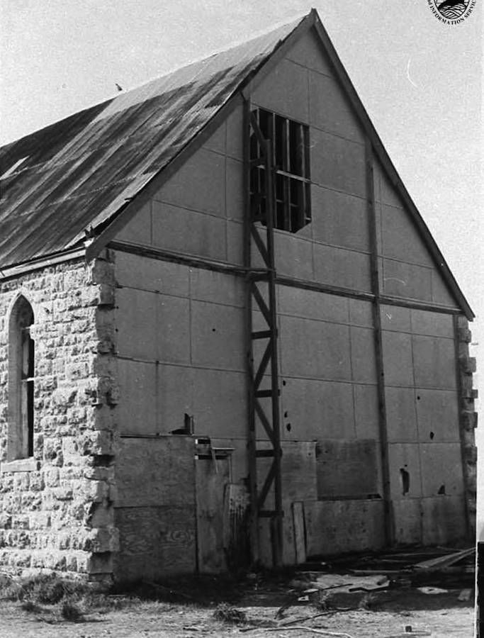 The foundation stone of this church was laid by Reverend G E Wheatley on 26.09.1898. The architect was W T Thorne. The church was extensively damaged by gales in June 1981 and demolished late October. Taken May 1980 by Betty McGeever. Fremantle Library photo #1290A and text.