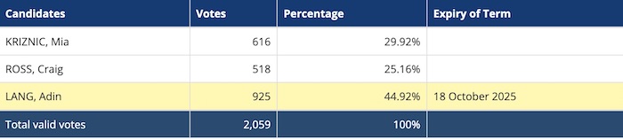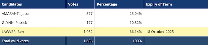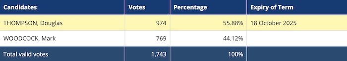 Postal voting closed 1800 Saturday 16 October, with the result announced before midnight.