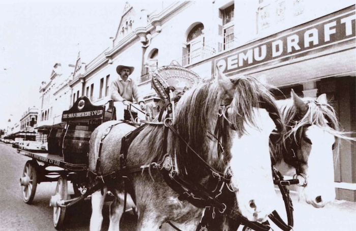 In the 1990s Clydesdales Baron and Bill, with driver Stephen Lockhart, still had hotels to visit around High Street. [Fremantle Herald]