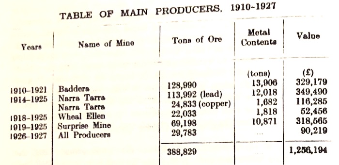 Foremost among the lead mines that produced rather irregularly up to 1870 but then began to dominate base metal output from the Field were the Geraldine. Wheal Ellen, Baddera, Narra Tarra and Wheal Fortune. Of these the last two produced only copper in the first three years of their respective histories.