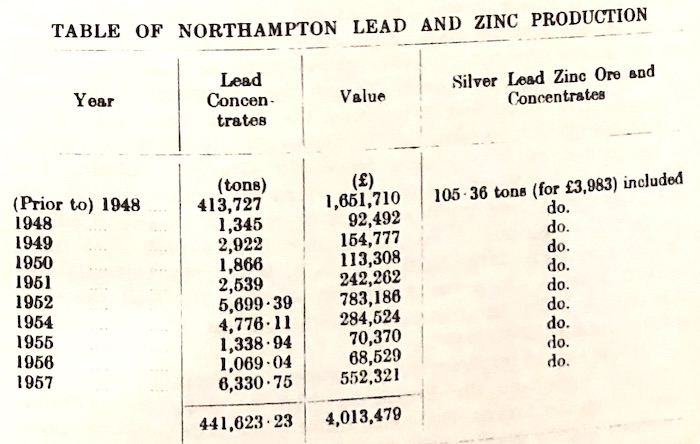 The Field’s productive period, 1910-1927, was so far ahead of its previous best that in each of the peak years, 1918-1920, the lead ore output exceeded that for the total period, 1850-1900. During these three years the average lead price of £32 per ton was the best experienced to that time in the history of the Field, but, when in the mid-1920's the price reverted to the pre-war level, production was to drop off dramatically. Nearly 350,000 tons of lead ore, valued at more than £1,000,000 were produced by the Northampton Mineral Field for the period, 1910-1927.