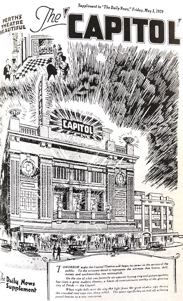 On 4th May 1929, seven months after the Ambassadors, the slightly larger Capitol Theatre made its debut and likewise offered Perth audiences attractive films supported by an orchestra of twenty and a ballet line of eight. It followed the alternative architectural style of neo-Gothic splendour which had already been employed less ambitiously in the Regent; it was the dignified style generally favoured by Hoyts Theatres, though best exemplified in Union’s State in Sydney which opened a few months later. The bold investment of a local syndicate headed by Dr A.J. Wright, the Capitol adjoined the Embassy Ballroom and both comprised the Temple Court Buildings which replaced the Esplanade Gardens at the foot of Wiliam Street. Like the Regent at the top of the street, it was graced by a fine chandelier and other impressive lighting effects both inside and out. A striking ornament of its commodious lounge foyer upstairs was a sculpted bust of the lately deceased and much lamented film actor Rudolph Valentino. Each side of