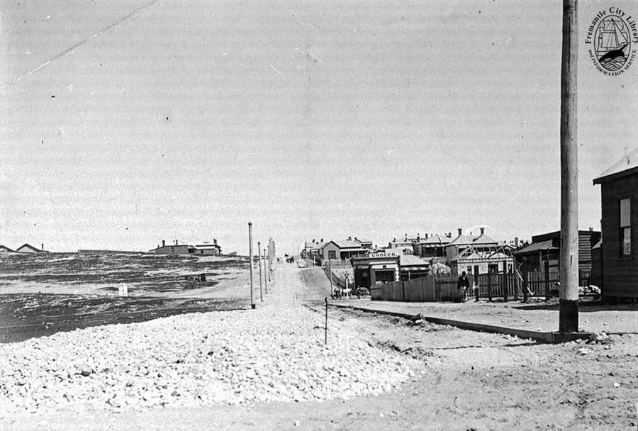 Photograph #707 c. 1906, from the Fremantle Library Local History Collection. Text from the Library entry. Signage on the former post office indicates that it was an antique shop, but it is long closed. The corner with Stirling Highway is now immediately after that building to the west.