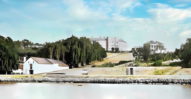 The photo (cropped, taken by Alfred Hawes Stone, colourised by Murray Barnard), shows the Stanley Brewery at left, the Pensioners Barracks centre, and the Bishop's House, right.