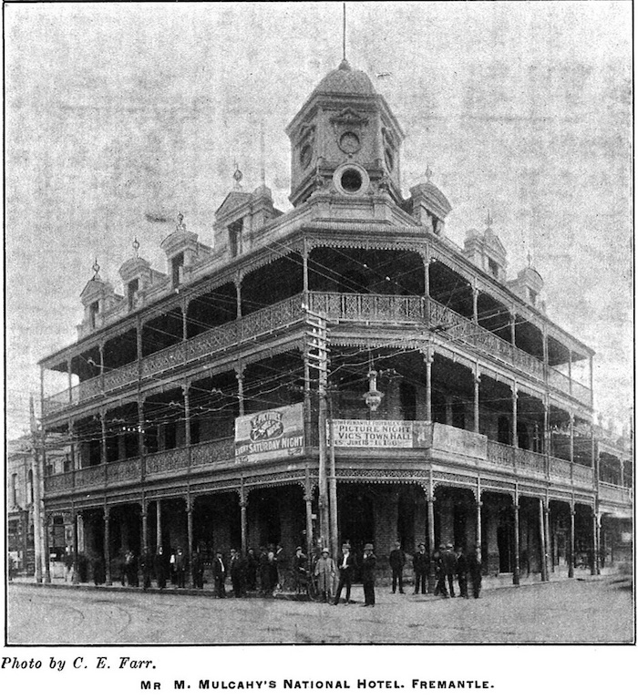 "The architect has, throughout, apparently, striven to produce something which will reflect the highest credit upon his profession, and when the building is completed, it should form a valuable addition to the architecture of Fremantle." The National Hotel was anticipated to cost between 7,000 and 8,000 pounds. Michael Mulcahy died in 1917 and until at least 1933 the hotel was still owned by Daniel Mulcahy. By 1948 ownership had changed to Mr. T. Dean who also owned the Central Hotel in Perth.