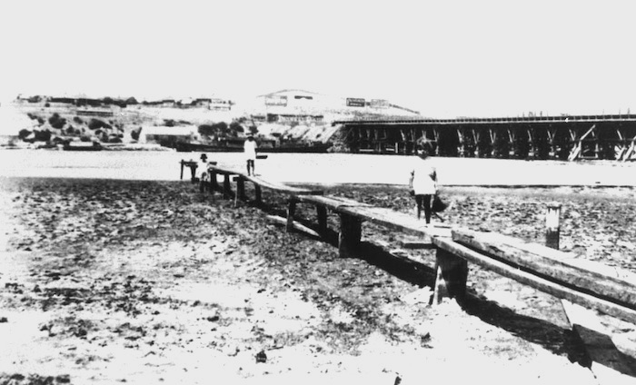 This small jetty was built at the rear of 35 Swan Street, North Fremantle to allow access to the river across the scum and slush effluent from the Swan Wool Scouring Company at 33 Swan Street. The girls are Joyce Helliwell, Hilda ? and Myrtle Helliwell (1913- ). The old traffic bridge, 1866-1947 is in the background. Ref. no. 4079.