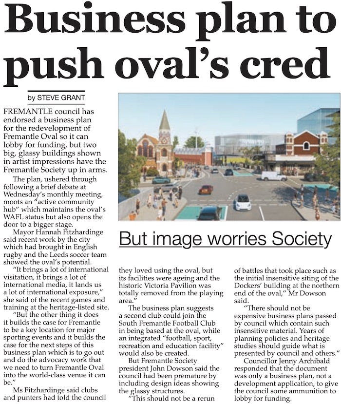The FCC briefly discussed the business plan for the Oval's development 27 July 2022. The Fremantle Herald reported (30 July 2022):