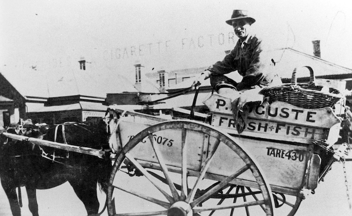 The man in this photo is not identified, except as P. Auguste. The SLWA caption for 005339D (sourced from Facebook): 'Greek migrants in WA. P. Auguste fresh fish cart outside Michelides cigarette factory, 1925'.