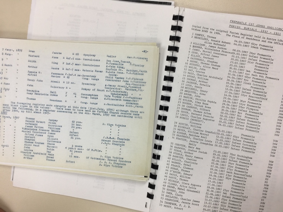 I took this photograph in the former Fremantle History Centre. If I remember correctly it shows a page of Kate Caldwell's transcription from church records, and the first page of Graham Bown's on the right.
