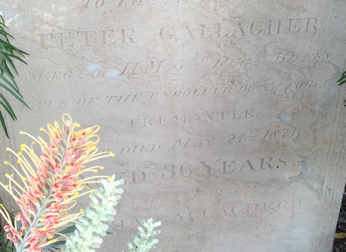 Peter Gallagher, who died in 1871 aged 37,* was a sergeant in the 3rd Buffs Regiment, and a Crimean War veteran who came to Fremantle on board the Edwin Fox in 1858 as an Enrolled Pensioner. He was wounded in the left hand by a shell fragment at Sevastopol 25 August 1855, losing two fingers, which rendered him unfit for further service. The cause of his early death is unknown. His gravestone is at (my) #82 on the Heritage Trail in Fremantle Cemetery.