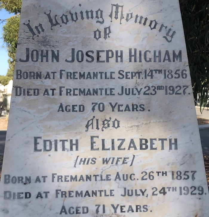 John Joseph Higham (son of John Henry Higham and Mary Ann Phipps) was born on 14-Aug-1856 in Fremantle. He died on there 23-Jul-1927. He married Edith Elizabeth Bateman (daughter of John Bateman and Rachel White) on 05-Jan-1882 in Fremantle, where she was born on 20-Aug-1857, also dying there on 24-Jul-1929. (Ward)
