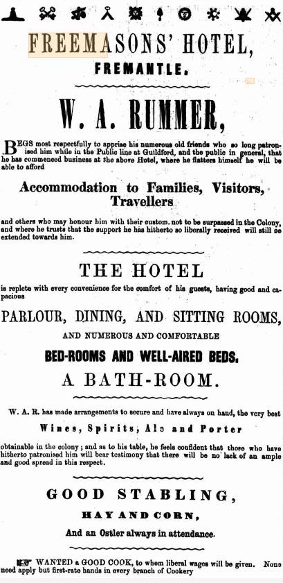 Rummer placed an advertisement on 23 Dec 1858 to indicate his move to Freemasons Hotel and introduce his successor at the Two Sisters in Guildford (Perth Gazette, 31 Dec 1858). It ran for many weeks into the new year 1859. On 12 Jan 1859 an advertisement appeared for the auction of his Two Sisters stock (Perth Gazette, 9 Jan 1859 ([below]). On 12 Jan 1859 the outgoing publican of the Freemasons introduced Rummer to the public (Inquirer, 18 Feb 1859).