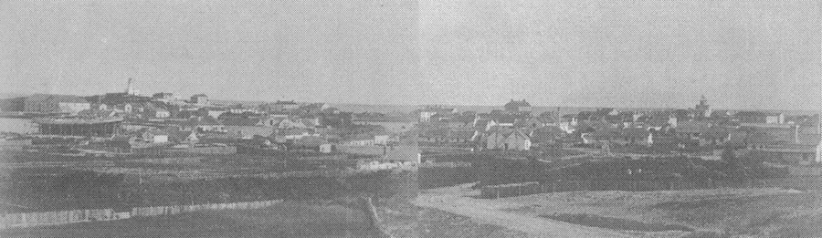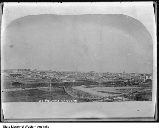 This is the earliest known photographic panorama of Fremantle. The scene shows the West End, looking northwest across the town. The white limestone, largely residential, buildings reflect the morning light. The townscape is dominated by the lighthouse, Round House, courthouse and harbour master’s house atop Arthur Head. Arthur Head was progressively and extensively quarried and the only building left on top there now is the 1831 Round House, the oldest public building in the state. To the far left is the large Commissariat store existing today as the Shipwreck Galleries of the Western Australian Museum and below it is evidence of the boat building that flourished along Marine Terrace. The three storeyed building in the middle is the Castle Hotel in Henry Street and to the right, the tallest building of all is Charles Manning’s massive home in Pakenham Street built to house his large family, with an observatory on top.