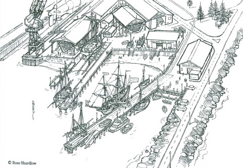 Ross Shardlow's concept drawing of the 2005 Slipways Development Concept, a report prepared by the ad hoc Fremantle Slipways Group, featuring Dago Bay at the centre, and retaining both existing jetties.