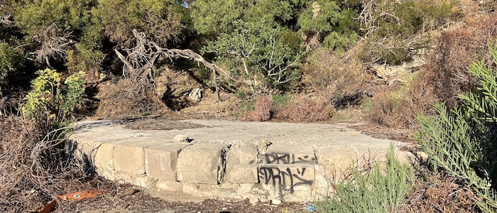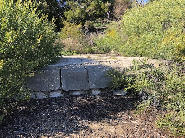 The capstan base in relation to Cantonment Hill on which the former Signal Station may be seen in the background. The stone base can just be seen as a white line across the middle of the photo, as the stone elevation is mostly in shadow. August 2020.