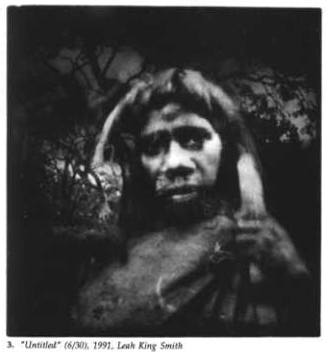 An Australian example of such an alternative voice 5 is found in the work of Leah King-Smith, an aboriginal artist who works with cibachrome, re-photography and a variety of contemporary manipulative techniques to 're-place' (her words) the Koori people pictured in early photographs, now held at the State Library of Victoria, in an Australian landscape of her own creation.6 Through a sophisticated and visually complex use of colour, composition and symbolism, King-Smith forces the viewer to unpack and reconsider the stereotypes of the last century, while controlling the images' present meaning in a format that grants a dignity the original circumstances of making did not.