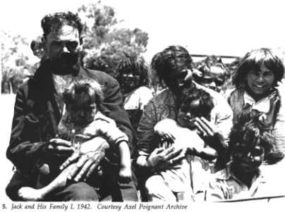 I would call Working Bullocks an expressive photograph. Elsewhere, I have referred to the way in which other photographs with the same quality, such as the aerials of the Anzac Day Service, and the Kalgoorlie Two-up School, sited among abandoned mineshafts, articulated contemporary ideas and located universal themes in particular historical moments (9). However, there are several photographs of Aboriginal people, taken between 1938 and 1942, which it is possible to consider in more depth because they received wider dissemination than was usual for Poignant's documentary images. They are Jack and his family, and two portraits, one of a young mother suckling her baby, and the other of an Aboriginal stockman, both taken on the Canning Stock Route in 1942. Because they have been read by some commentators as "sympathetic" and expressing "humanism", these portraits have been seen as marking a change in the portrayal of Aborigines. For the remainder of this essay, therefore, I want to examine this proposition by contextualising them both in their own period and in relation to the imaging of Aborigines in earlier periods.