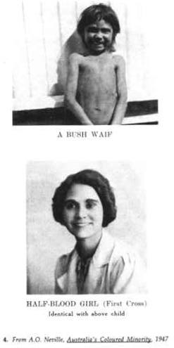 However, within the thirties discourse on Aboriginal matters it is possible to discern several specific ways in which photographs were used, by the ameliorators, the policy makers, and others. In the course of his administration of the Southern district, O.A. Neville (the Protector of Aborigines, and later Commissioner for Native Affairs), had come to the conclusion that 'the destiny of the natives of aboriginal origin, but not of the full-blood, lies in their ultimate absorption'.18 Since 1915 he had kept meticulous records of the people under his control and believed that he could establish the ratio of the racial mixture in most of them - ideas which he later expounded in Australia's Coloured Minority.