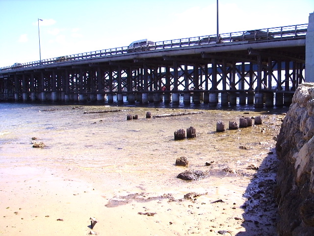 East of the dominating bridge is a pleasant little sandy beach. This is looking back westward.